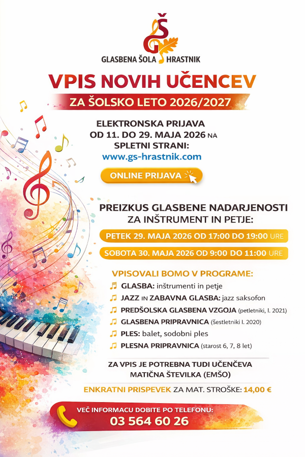 • Vpis novih učencev za šolsko leto 2026/2027